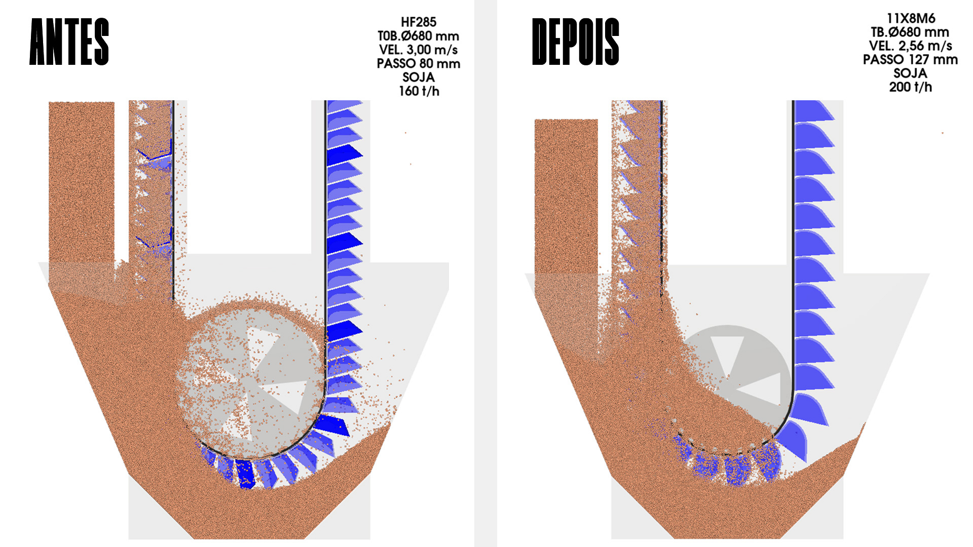 A equipe de engenharia dimensionou novos motoredutores já na condição de potência e velocidade adequadas às novas capacidades de 200 t/h, junto ao kit de correias e canecas adequados para tal movimentação.