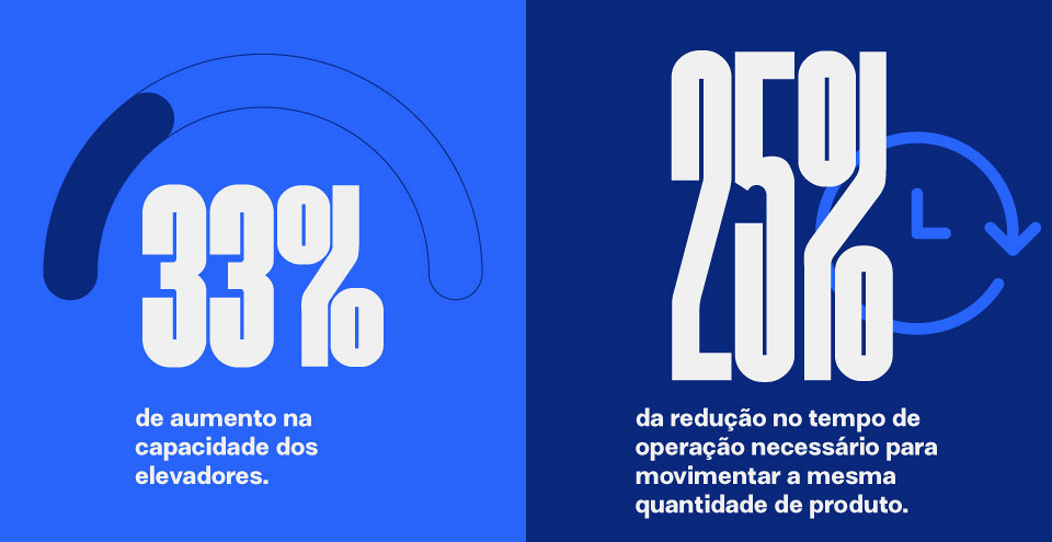Ganho de capacidade: A implementação dessas soluções resultou em um aumento de capacidade de aproximadamente 33% em todos os elevadores, passando de uma média de 150 t/h para 200 t/h.