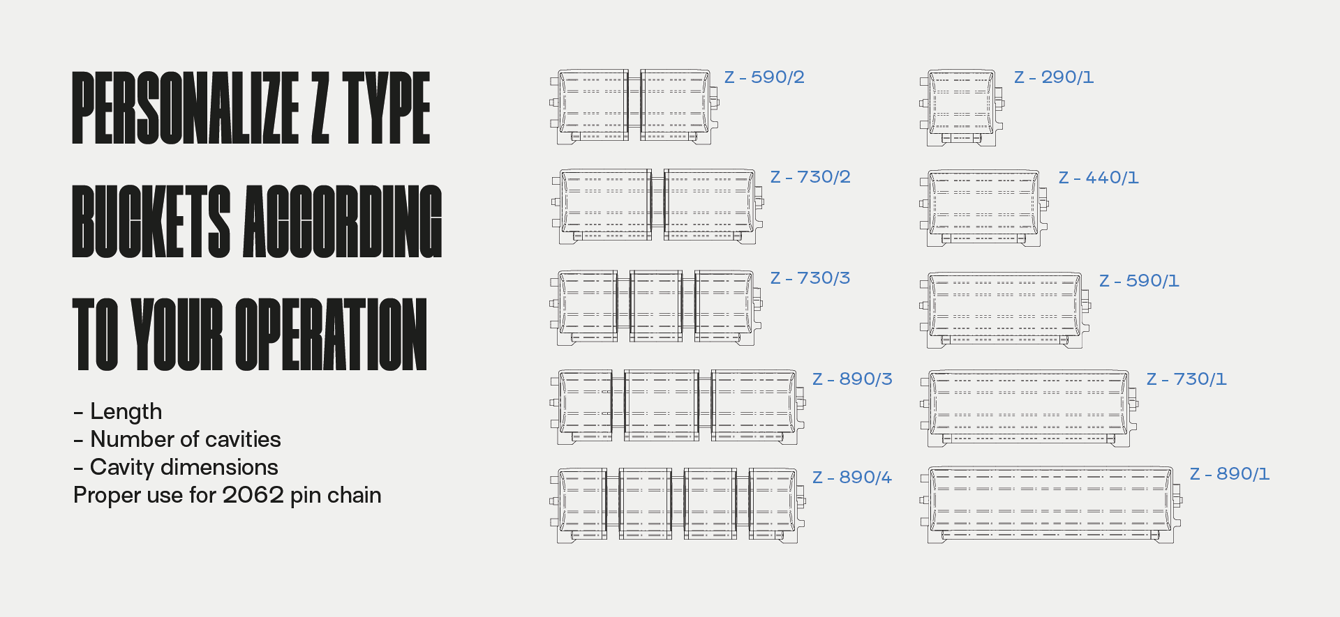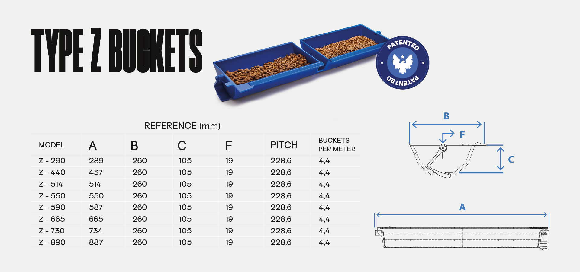 The Z type Ucelo bucket was developed for continuous operations of fragile products. It is suitable for installation on Z, C, S, and similar-shaped chain elevators. Highly versatile, it features a Flap System, allowing horizontal and vertical movement with a lower level of mechanical damage to the transported material and flexibility in feeding and discharging at multiple points along the conveyor.