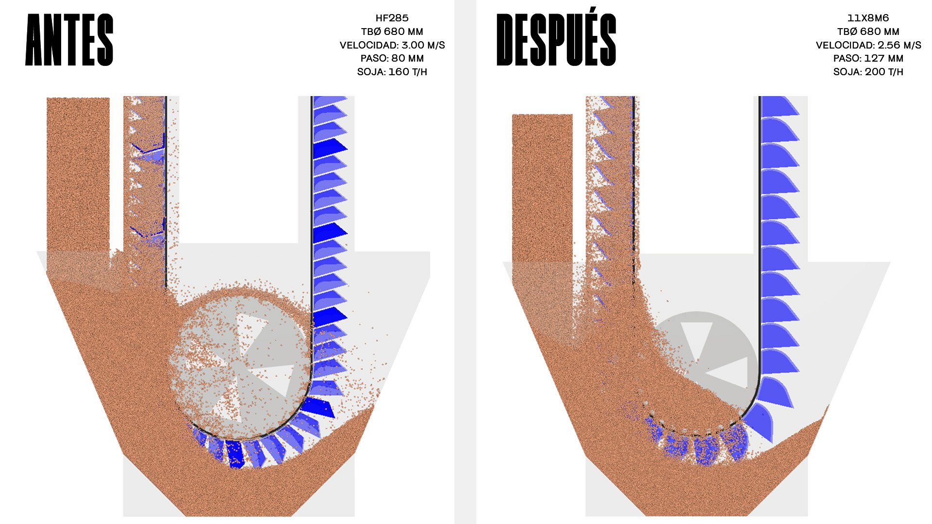 El equipo de ingeniería dimensionó nuevos motoredutores con la potencia y velocidad adecuadas para la nueva capacidad de 200 t/h, junto con los kits de correas y canecas adecuados para tal movimiento.
