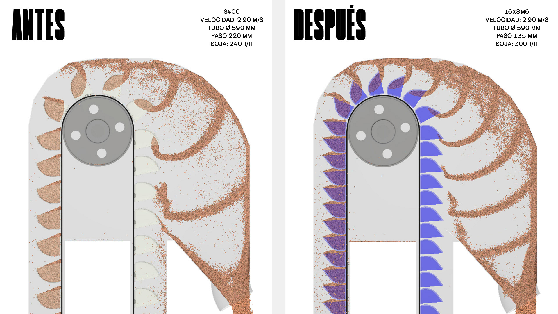 Los cangilones instalados en el empalme superpuesto tenían una mayor proyección, lo que generaba una sobrecarga que resultaba en desgaste y rotura prematura de los productos.