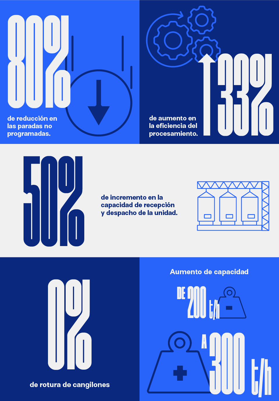 Mejora de Rendimiento: Las soluciones implementadas por Ucelo aumentaron la capacidad operativa de 200 t/h a 300 t/h, un incremento del 50% en la capacidad de recepción y expedición de la unidad.