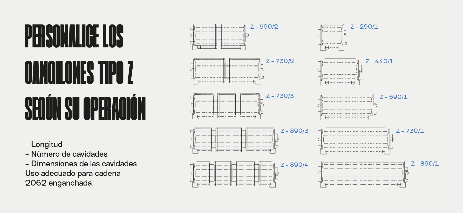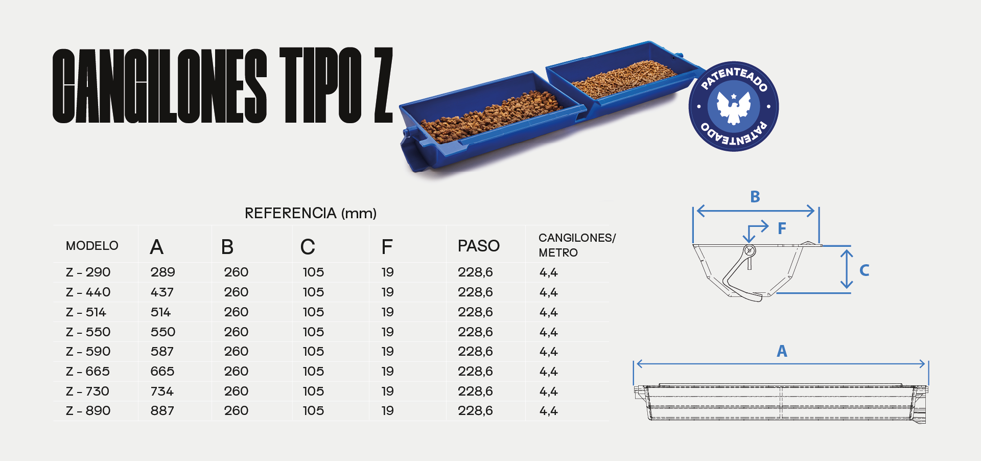 Los cangilones tipo Z Ucelo fueron desarrollados para operaciones continuas de productos frágiles. Son adecuados para su instalación en elevadores de cadena con forma Z, C, S y similares. Altamente versátiles, cuentan con el Flap System, permitiendo movimiento horizontal y vertical con un menor nivel de daño mecánico al material transportado y flexibilidad en la alimentación y descarga en varios puntos del transportador.